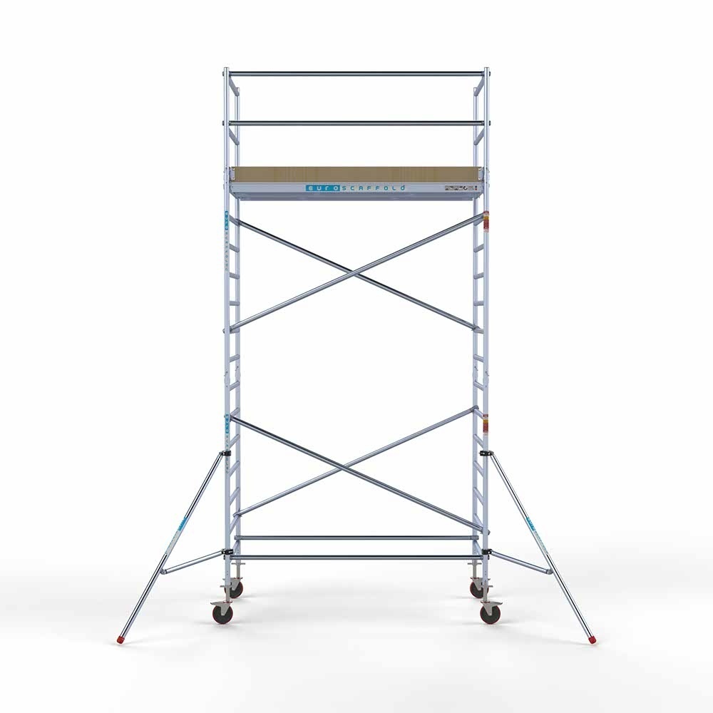 Dieses komplette (inkl. Ausleger) Basis-Rollgerüst hat eine Breite von 135 cm, eine Länge von 250 cm und eine Arbeitshöhe von 6,2 Metern. Das Gerüst ist bekannt für seine einfache Handhabung und lange Lebensdauer. Dieses Gerüst ist auch für Heimwerker und professionelle Handwerker für den Innen- und Außenbereich geeignet.