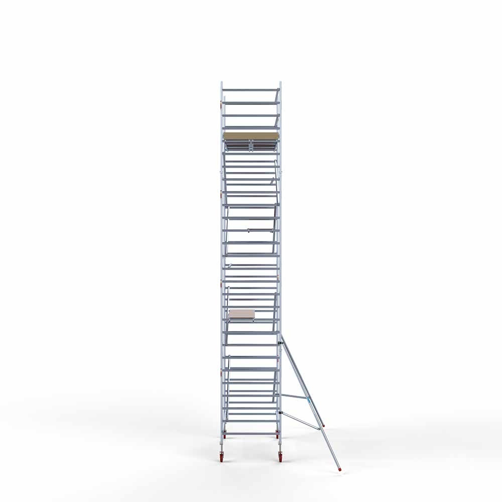 Dieses Basis-Rollgerüst hat eine Breite von 135 cm, eine Länge von 250 cm und eine Arbeitshöhe von 9,2 Metern. Das Gerüst ist für seine einfache Handhabung und lange Lebensdauer bekannt. Dieses Gerüst ist auch für Heimwerker und professionelle Handwerker für den Innen- und Außenbereich geeignet.