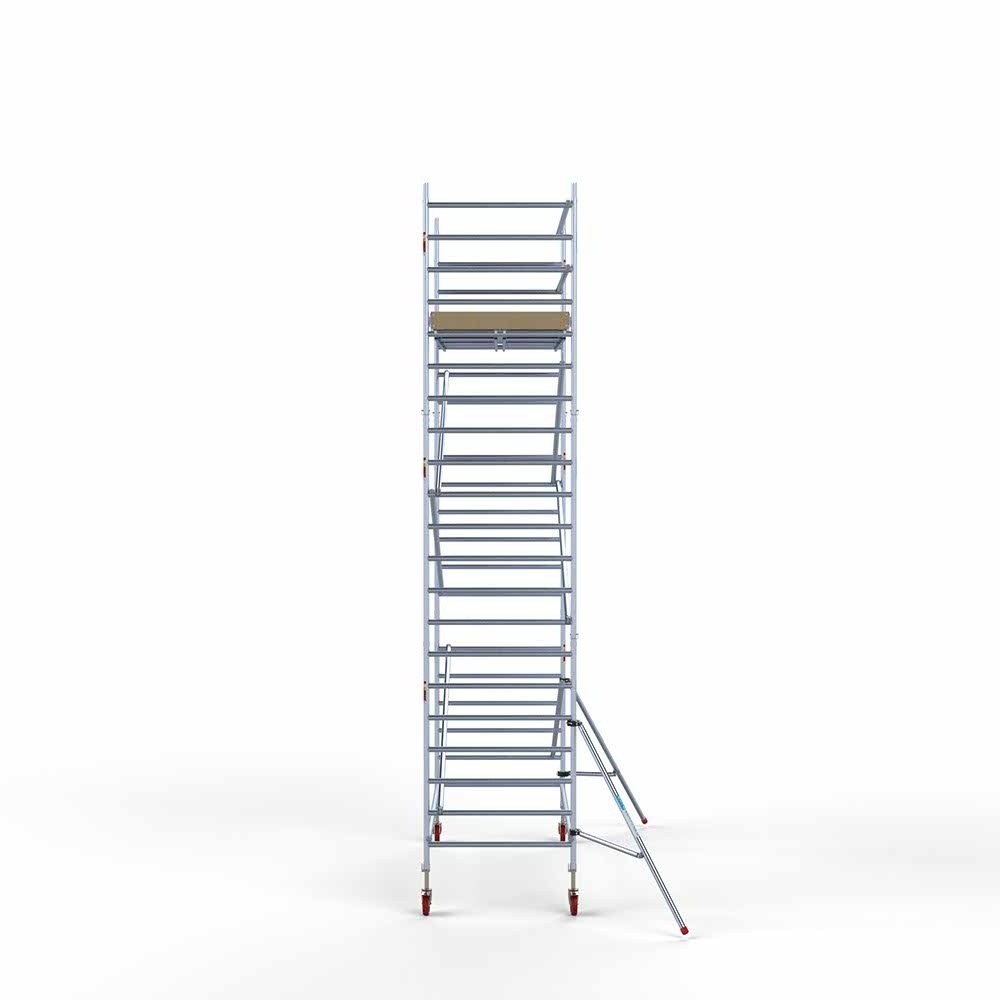 Dieses semiprofessionelle Basis-Rollgerüst hat eine Breite von 135 cm, eine Länge von 305 cm und eine Arbeitshöhe von 7,2 Metern. Diese Gerüstserie verfügt über eine Grundausstattung, die es zu einem Gerüst für Heimwerker und professionelle Handwerker für den Innen- und Außenbereich macht. Es bietet einen stabilen und sicheren Platz zum Arbeiten in der Höhe und entspricht den europäischen Normen. Außerdem ist das Rollgerüst dank der Aufkleber auf den Streben, die den Aufbau erleichtern, und des leichten Aluminiummaterials, durch das das Rollgerüst leicht zu bewegen ist, sehr benutzerfreundlich.
