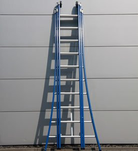 DAS Atlas Dreifachleiter 3x16 Stufen, mit einer dunkelblauen Beschichtung, die schmutzige Hände und Korrosion des Aluminiums verhindert. Die Leiter bietet eine extra breite Standfläche mit rutschfestem Profil.