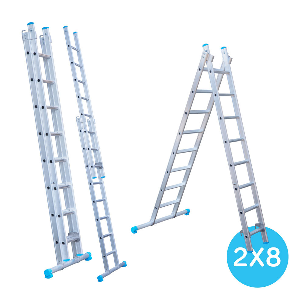 Gerade zweiteilige Reformleiter mit 2x8 Stufen, für Arbeiten im Innen- und Außenbereich in verschiedenen Höhen. Die Leiter kann auch in der A-Position abgestellt werden und muss nicht an eine Fassade gelehnt werden. Die 2-teilige Leiter aus strapazierfähigem, glänzendem Aluminium ist durch ihr geringes Gewicht leicht zu bewegen. Eingefahren ist die Leiter 2,25 Meter lang und ausgefahren bis zu 3,5 Meter. Die Reformleiter von Eurostairs ist mit zusätzlichen Verstärkungspunkten und Anti-Rutsch-Kappen ausgestattet, um ein Abrutschen zu verhindern. Dank der Stabilitätsstange steht die Leiter besonders sicher. Die Leiter ist gemäß der europäischen Gesetzgebung EN131 zugelassen und für den professionellen Gebrauch geeignet.