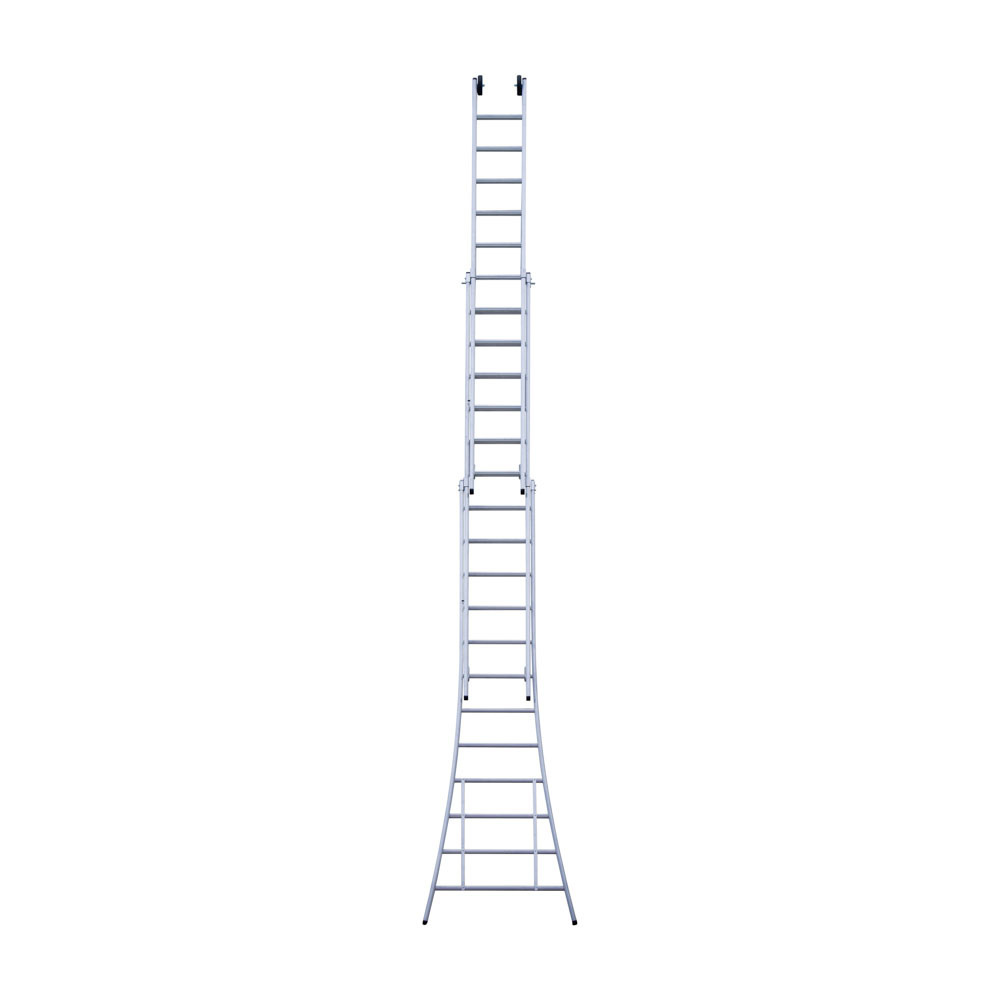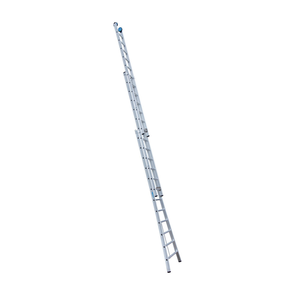 Diese dreiteilige, multifunktionale Reformleiter mit 3x12 Sprossen ist ideal für Arbeiten in verschiedenen Höhen. Die Eurostairs-Leiter kann als Schiebeleiter verwendet werden, sie kann aber auch frei in der A-Position abgestellt werden. Eingefahren hat die Leiter eine Länge von 3,25 m und ausgefahren bis zu 7,75 m, mit einer maximalen Arbeitshöhe von 8,75 m. Die leichte Leiter ist aus eloxiertem Aluminium gefertigt, so dass sie nicht verrutscht und eine längere Lebensdauer hat. Die Reformleiter ist außerdem mit zusätzlichen Verstärkungspunkten, breiten Stufen, Anti-Rutsch-Kappen und Giebelrollen ausgestattet. Zugelassen nach der europäischen Norm EN131 und für den professionellen Einsatz geeignet.