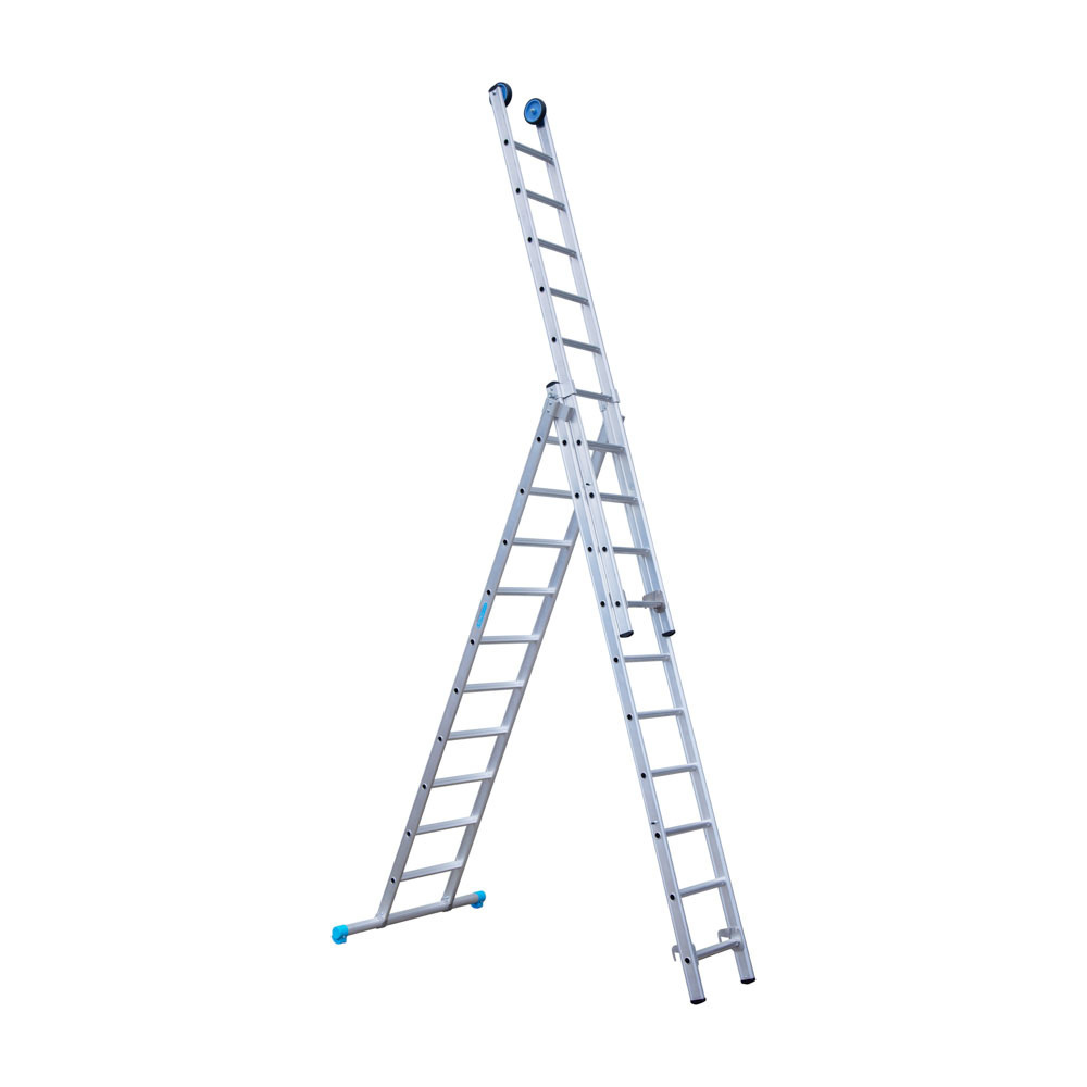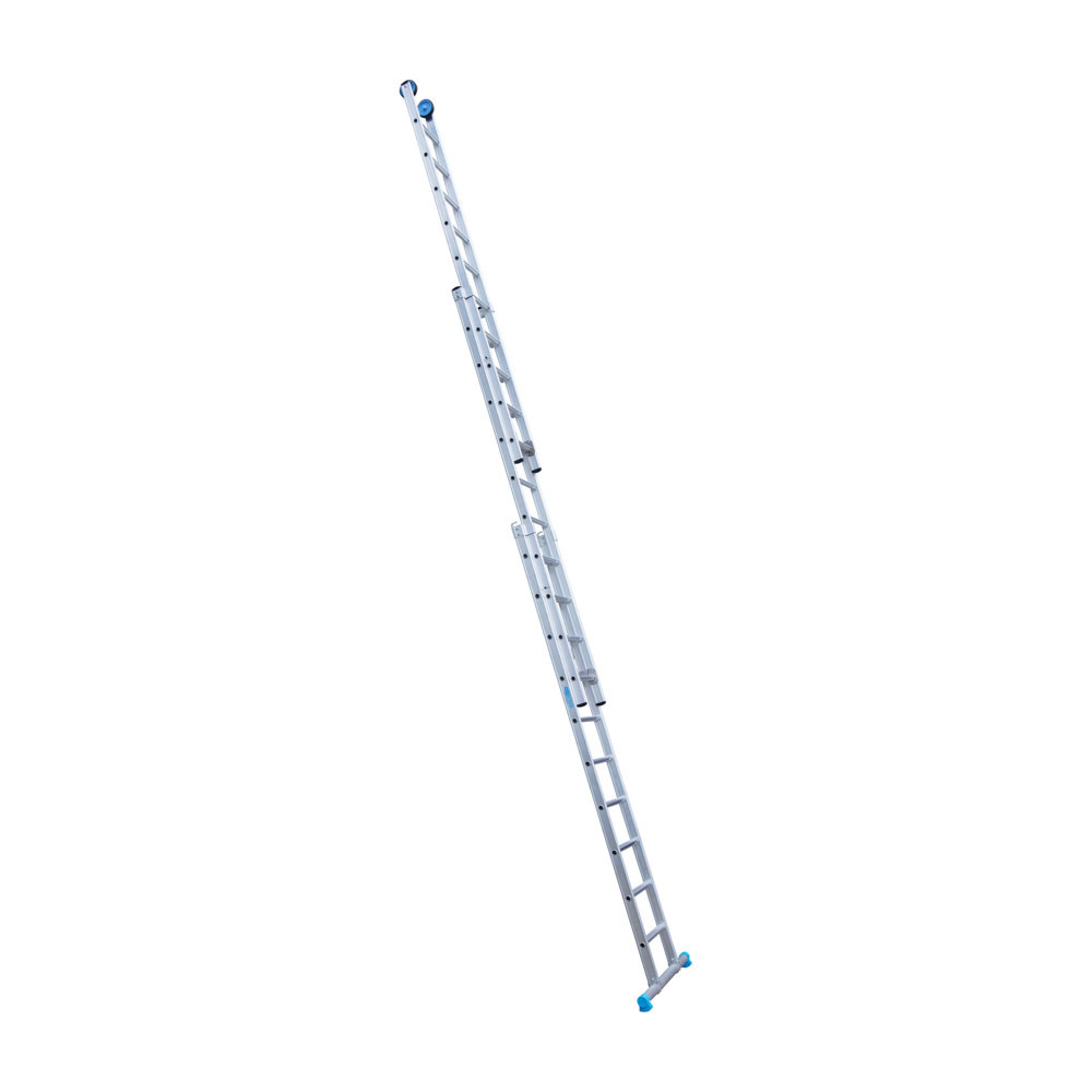 Dreiteilige, robuste Aluminium-Reformleiter von Eurostairs mit 3x10 Sprossen für Arbeiten in verschiedenen Höhen. Die Leiter kann als Schiebeleiter oder freistehend verwendet werden. Eingefahren hat die Leiter eine Länge von 2,75 m und ausgefahren bis zu 6,25 m, mit einer maximalen Arbeitshöhe von 8 m. Die 3-teilige Vielzweckleiter ist platzsparend und dank ihres geringen Gewichts leicht zu handhaben und zu bewegen. Die professionelle Reformleiter ist mit zusätzlichen Verstärkungspunkten, breiten Stufen und rutschhemmenden Kappen ausgestattet und wird inklusive Giebelrollen geliefert. Dank der Stabilitätsstange steht die Leiter sehr sicher. Zugelassen gemäß der europäischen Gesetzgebung EN131.