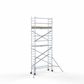 Der Anhänger wird mit einem Aluminium Basis Rollgerüst mit einer Arbeitshöhe von 7,2 Metern, einer Breite von 75 cm und einer Länge von 250 cm geliefert. Es ist unser gängigstes Gerüst, das häufig für professionelle Arbeiten im Freien verwendet wird, gerade wegen seiner breiten Arbeitsfläche und seiner zusätzlichen Stabilität. Das Gerüst ist leicht zu handhaben, bietet ausreichend Arbeitsfläche und lässt sich einfach auf- und abbauen. Kurzum: Qualität zu einem wettbewerbsfähigen Preis!