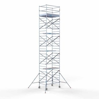 Der Anhänger wird mit einem Aluminium-Rollgerüst komplett mit einer Arbeitshöhe von 10,2 Metern, einer Breite von 135 cm und einer Länge von 190 cm geliefert. Es ist unser gängigstes Gerüst, das häufig für professionelle Arbeiten im Freien verwendet wird. Das Gerüst ist leicht zu handhaben, bietet ausreichend Arbeitsfläche und lässt sich einfach auf- und abbauen. Kurz gesagt: Qualität zu einem wettbewerbsfähigen Preis!