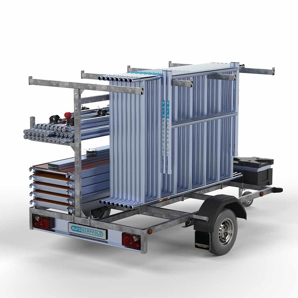 Unser Euroscaffold Gerüstanhänger ist von höchster Qualität und RDW-geprüft. Der Gerüstanhänger misst 250 cm x 158 cm. Er bietet Platz für ein Rollgerüst mit einer maximalen Arbeitshöhe von 14 Metern, und der Anhänger lässt sich leicht an Ihren Arbeitsbus ankoppeln. Auf diese Weise sind Sie schnell auf dem Weg zum nächsten Auftrag!