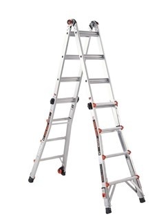 Teleskopische Klappleiter in mehreren Positionen für den Profi. Im eingefahrenen Zustand nimmt die Klappleiter nur wenig Platz ein. Sie passt in jeden Transporter. Außerdem ist sie dank der flexiblen Lenkrollen leicht zu transportieren.