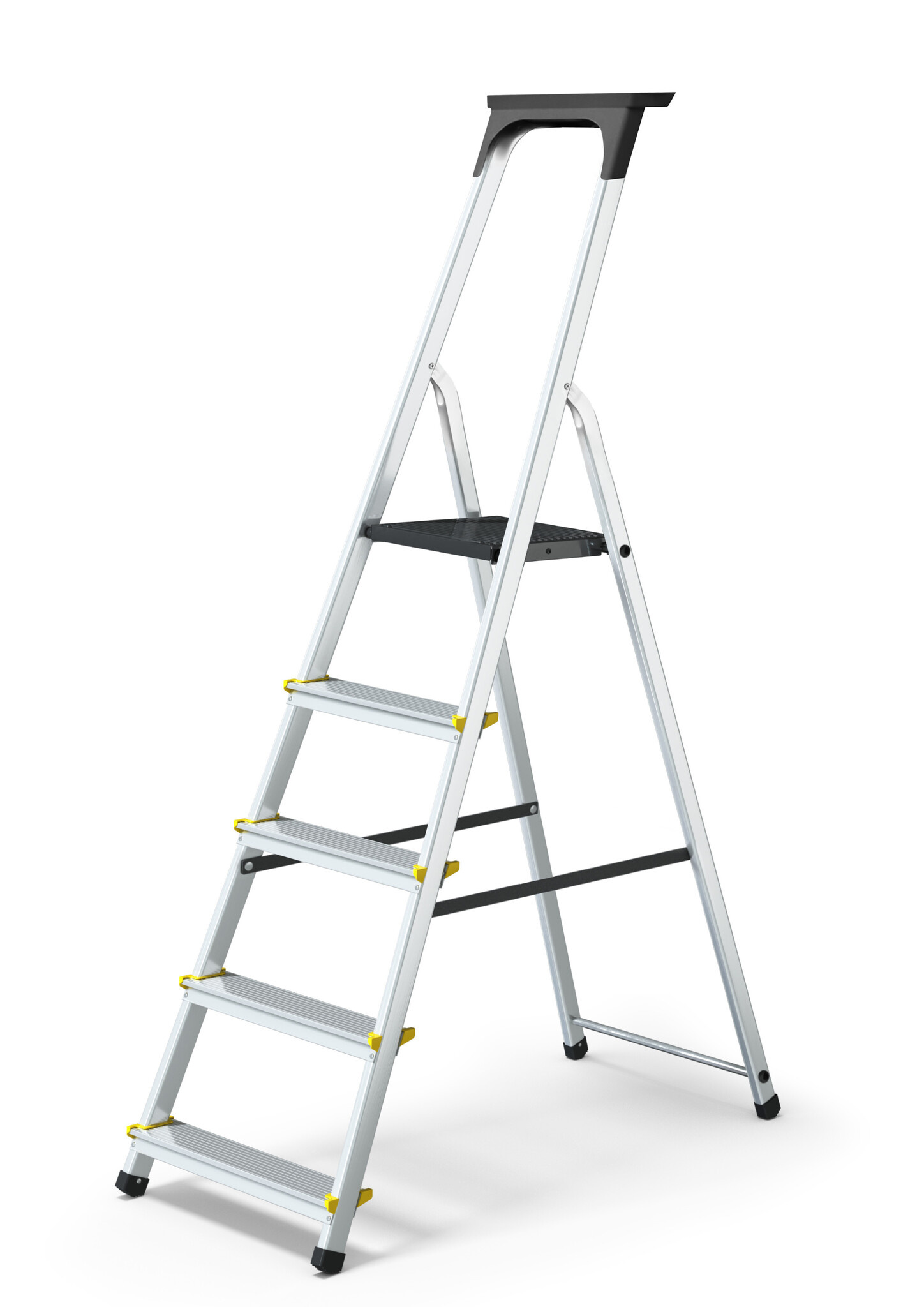 Wer kennt sie nicht, die einfache Trittleiter für den Haushalt? Die bekannte Einstiegsleiter, die in jedem Haushalt zu finden ist. Die oberste Stufe, auch Podest genannt, ist extra groß, so dass der gesamte Fuß auf das Podest passt. Dies bietet mehr Stehkomfort. Oben an der Halterung befindet sich eine kleine Werkzeugablage für kleine Werkzeuge. Praktisch, um nicht ständig auf- und abzusteigen, um Materialien zu greifen und/oder zu wechseln.