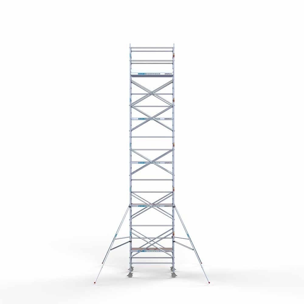 Dieses professionelle Rollgerüst hat eine Breite von 135 cm, eine Länge von 190 cm und eine Arbeitshöhe von 11,2 Metern. Ein sehr komplettes Rollgerüst, das mit zwei nebeneinander liegenden Plattformen eine extra große Arbeitsfläche von 120 cm erreicht. So haben Sie immer den Platz, um bequem in der Höhe zu arbeiten.