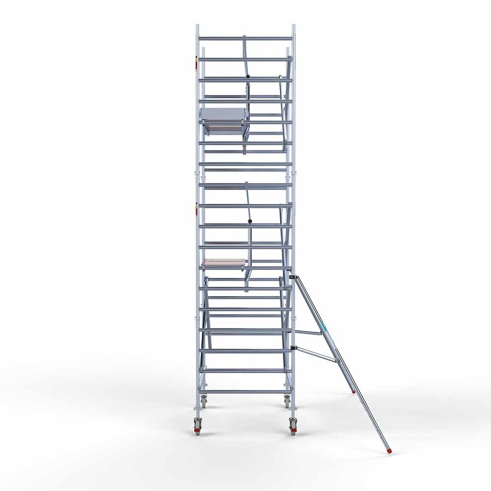 Ein professionelles Rollgerüst mit einer Breite von 135 cm, einer Länge von 190 cm und einer Arbeitshöhe von 6,2 Metern. Ein sehr komplettes Rollgerüst, das mit zwei nebeneinander liegenden Plattformen eine extra große Arbeitsfläche von 120 cm bietet. So haben Sie immer den Platz, um bequem in der Höhe zu arbeiten.