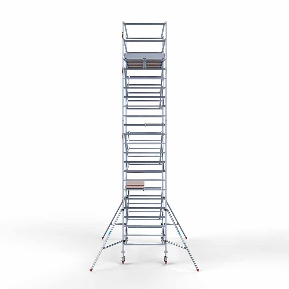 Dieses professionelle Rollgerüst hat eine Breite von 135 cm, eine Länge von 190 cm und eine Arbeitshöhe von 8,2 Metern. Ein sehr komplettes Rollgerüst, das mit zwei nebeneinander liegenden Plattformen eine extra große Arbeitsfläche von 120 cm erreicht. So haben Sie immer den Platz, um bequem in der Höhe zu arbeiten.