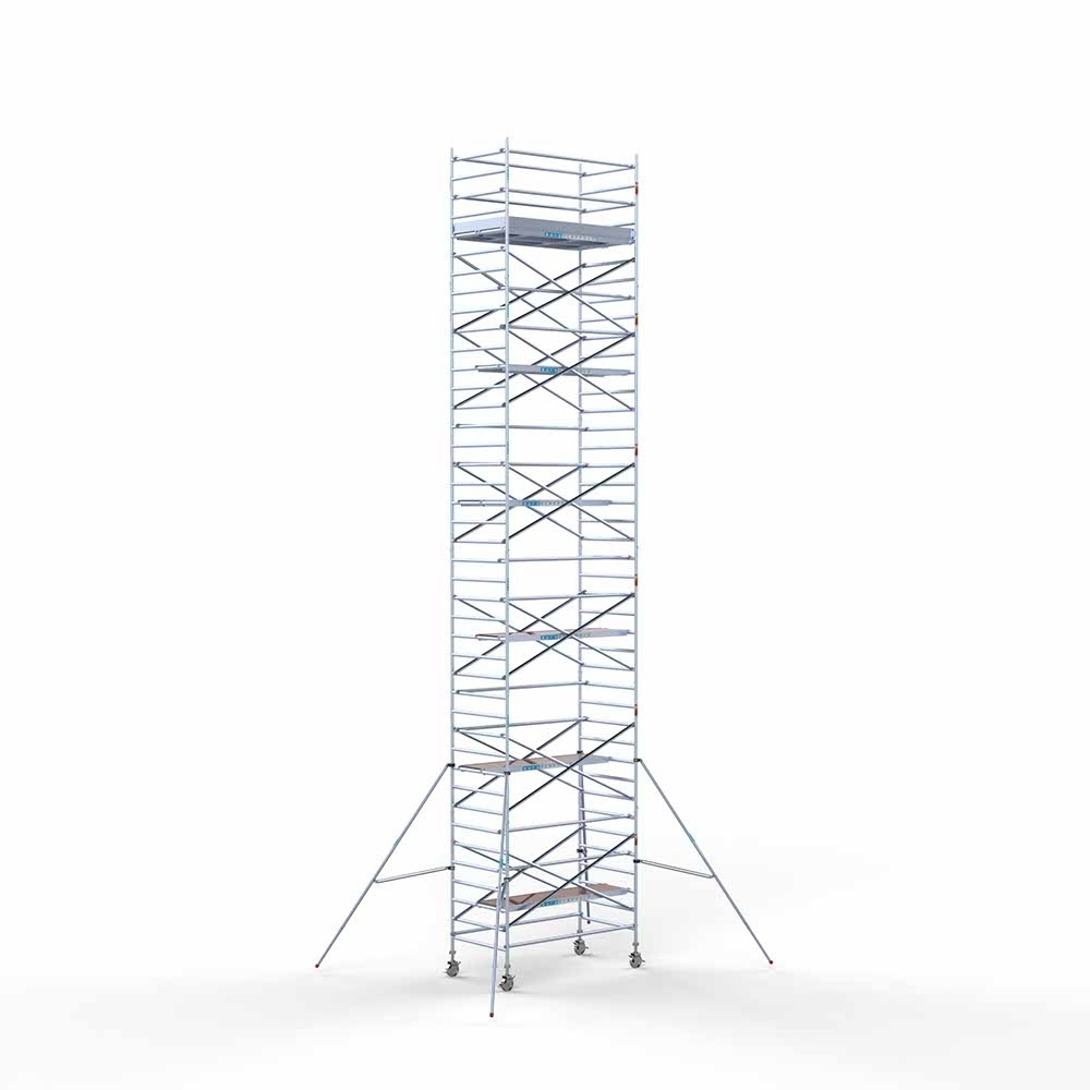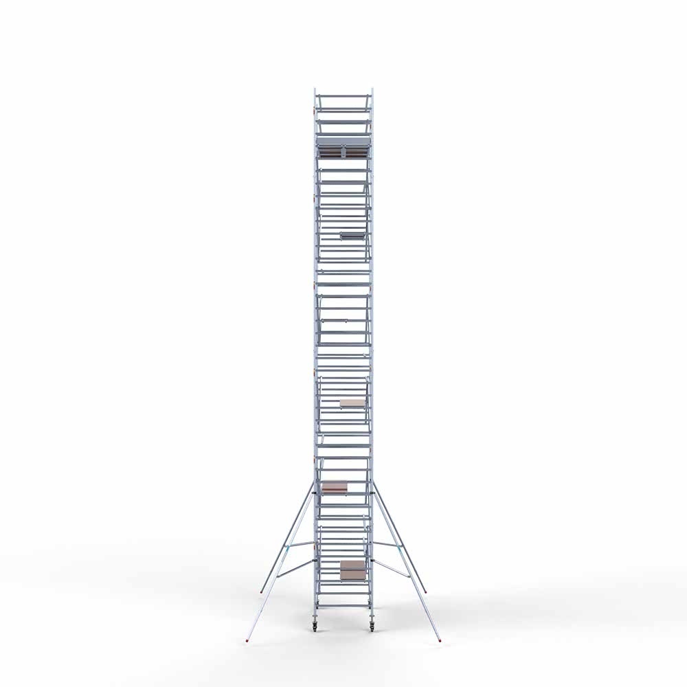 Dieses professionelle Rollgerüst hat eine Breite von 135 cm, eine Länge von 250 cm und eine Arbeitshöhe von 13,2 Metern. Ein sehr komplettes Rollgerüst, das mit zwei nebeneinander liegenden Plattformen eine extra große Arbeitsfläche von 120 cm erreicht. So haben Sie immer den Platz, um bequem in der Höhe zu arbeiten.