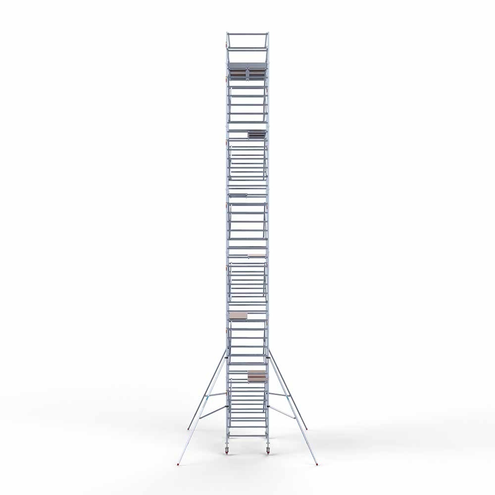 Dieses professionelle Rollgerüst hat eine Breite von 135 cm, eine Länge von 205 cm und eine Arbeitshöhe von 14,2 Metern. Ein sehr komplettes Rollgerüst, das mit zwei nebeneinander liegenden Plattformen eine extra große Arbeitsfläche von 120 cm erreicht. So haben Sie immer den Platz, um bequem in der Höhe zu arbeiten.