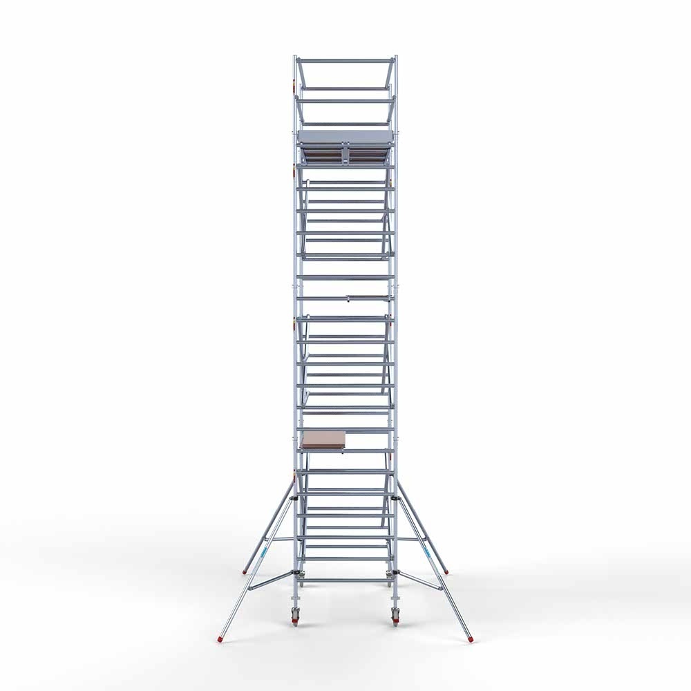 Dieses professionelle Rollgerüst hat eine Breite von 135 cm, eine Länge von 205 cm und eine Arbeitshöhe von 8,2 Metern. Ein sehr komplettes Rollgerüst, das mit zwei nebeneinander liegenden Plattformen eine extra große Arbeitsfläche von 120 cm bietet. So haben Sie immer den Platz, um bequem in der Höhe zu arbeiten.