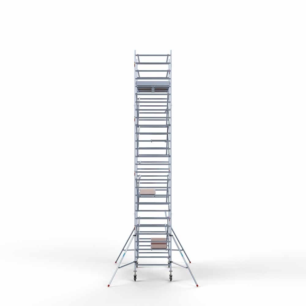 Dieses professionelle Rollgerüst hat eine Breite von 135 cm, eine Länge von 205 cm und eine Arbeitshöhe von 9,2 Metern. Ein sehr komplettes Rollgerüst, das mit zwei nebeneinander liegenden Plattformen eine extra große Arbeitsfläche von 120 cm erreicht. So haben Sie immer den Platz, um bequem in der Höhe zu arbeiten.