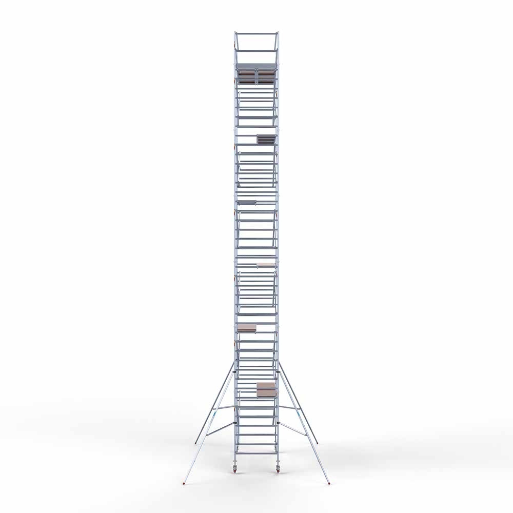 Dieses professionelle Rollgerüst hat eine Breite von 135 cm, eine Länge von 305 cm und eine Arbeitshöhe von 14,2 Metern. Ein sehr komplettes Rollgerüst, das mit zwei nebeneinander liegenden Plattformen eine extra große Arbeitsfläche von 120 cm erreicht. So haben Sie immer den Platz, um bequem in der Höhe zu arbeiten.