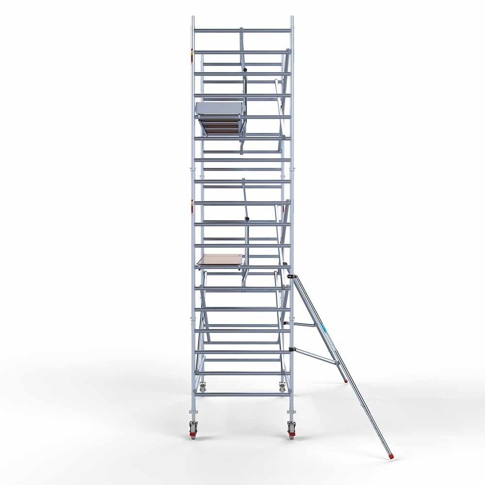 Ein professionelles Rollgerüst mit einer Breite von 135 cm, einer Länge von 305 cm und einer Arbeitshöhe von 6,2 Metern. Ein sehr komplettes Rollgerüst, das mit zwei nebeneinander liegenden Plattformen eine extra große Arbeitsfläche von 120 cm bietet. So haben Sie immer den Platz, um bequem in der Höhe zu arbeiten.