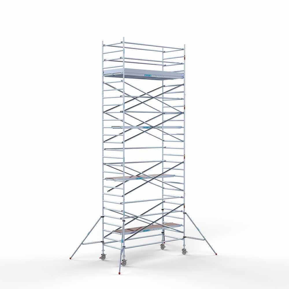 Dieses professionelle Rollgerüst hat eine Breite von 135 cm, eine Länge von 305 cm und eine Arbeitshöhe von 9,2 Metern. Ein sehr komplettes Rollgerüst, das mit zwei nebeneinander liegenden Plattformen eine extra große Arbeitsfläche von 120 cm erreicht. So haben Sie immer den Platz, um bequem in der Höhe zu arbeiten.