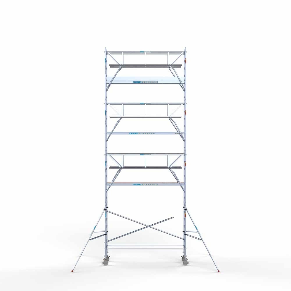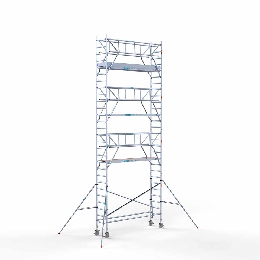 Dieses komplette professionelle Rollgerüst entspricht der neuen Norm 2018, einschließlich Montagesystem mit Frontgeländer. Mit diesem Montagesystem sind Sie während des Auf- und Abbaus vor der Gefahr eines Absturzes geschützt. Dieses Rollgerüst garantiert eine einfache Handhabung, eine sehr lange Lebensdauer, ist direkt ab Lager lieferbar und wird in den Niederlanden und Belgien kostenlos versandt.