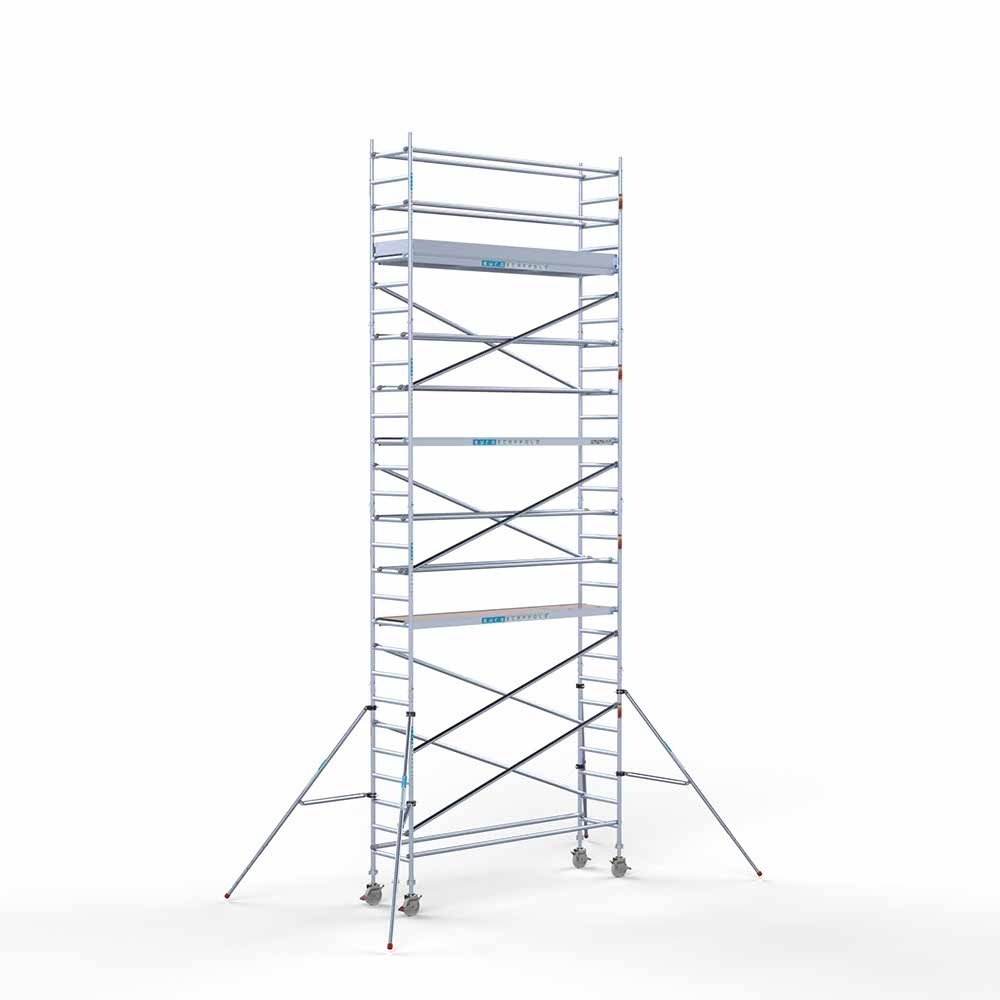 Dieses Rollgerüst ist aus stabilem und leichtem Aluminium gefertigt und hat eine Breite von 75 cm und eine Plattformlänge von 305 cm. Die maximale Arbeitshöhe beträgt 9,2, was dieses Rollgerüst zu einer perfekten Größe für professionelle Arbeiten macht. Das Material unterscheidet sich von unseren Basis-Rollgerüsten, zum Beispiel durch Bordbretter (Aluminium) oder Gerüsträder mit einer schwereren Tragfläche (800 kg statt 300 kg). Daher empfehlen wir diese Rollgerüste für den mehrfachen professionellen Einsatz.