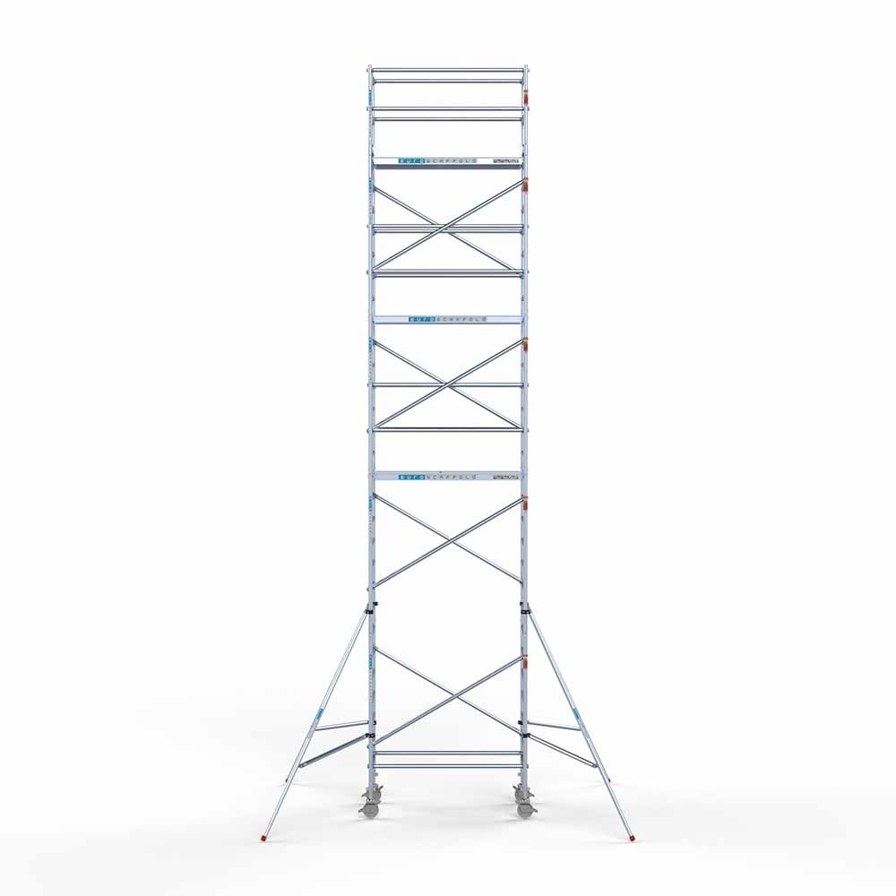 Dieses professionelle Rollgerüst komplett hat eine einzigartige Breite von 90 cm, eine Länge von 190 cm und eine Arbeitshöhe von 10,2 Metern. Diese Gerüstserie hat eine sehr komplette Ausstattung, die es zu einem vielseitig einsetzbaren Gerüst macht. Es bietet einen stabilen und sicheren Platz zum Arbeiten in der Höhe. Außerdem ist das Rollgerüst sehr benutzerfreundlich, z.B. durch die Aufkleber auf den Streben, die den Aufbau erleichtern, oder durch das leichte Aluminiummaterial, das das Rollgerüst einfach zu bewegen macht.