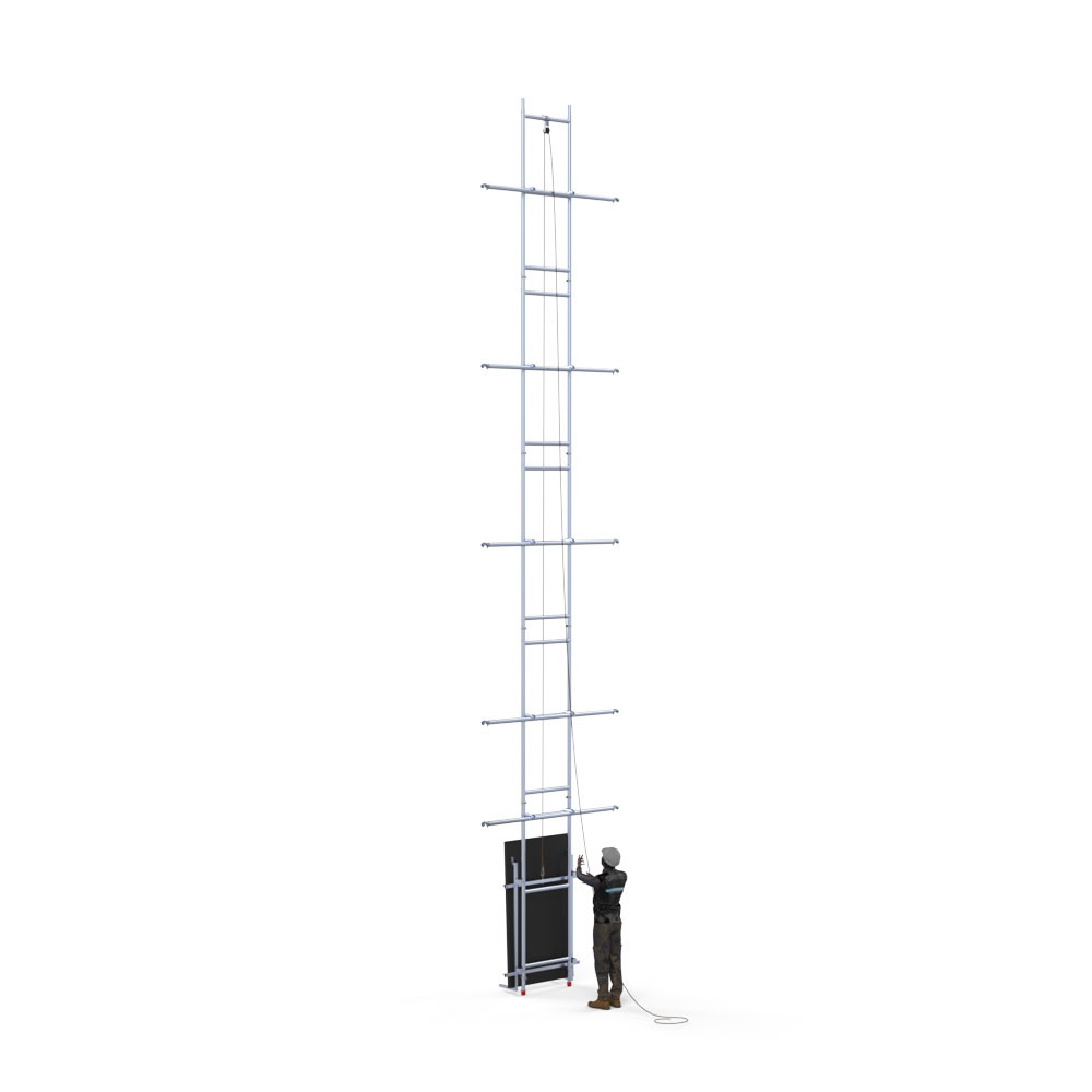 Legen Sie das Solarmodul in die Hubeinheit des Gerüstlifts und heben Sie das Modul über das Hubseil auf die gewünschte Höhe. Das Heben von Solarmodulen war noch nie so einfach. Kein umständliches manuelles Heben von schweren Solarmodulen auf die höchste Gerüstplattform mehr. Völlig gesundheits- und sicherheitsfreundlich und mit weniger Unfallrisiko.