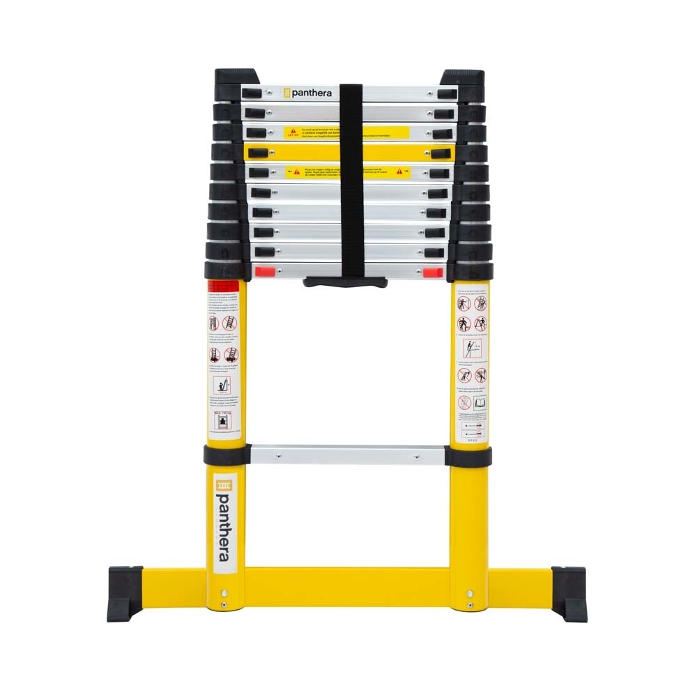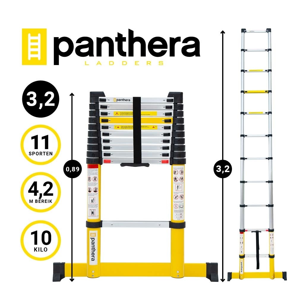Sie suchen eine Teleskopleiter mit einer Arbeitshöhe von 4,2 Metern? Diese Teleskopleiter von Panthera ist aus hochwertigem Aluminium gefertigt und daher sehr leicht. Die Leiter ist kompakt, was sehr praktisch ist, wenn Sie die Leiter lagern, transportieren oder bewegen möchten. Die Teleskopleiter verfügt über ein Soft-Close-Klicksystem, das ein sicheres Ein- und Ausklappen gewährleistet und verhindert, dass die Sprossen auf Hände oder Finger fallen. Die Leiter ist mit Wandabstandhaltern ausgestattet, damit sie leichter und fester an der Wand befestigt werden kann, und mit rutschfesten Füßen, die ein Verrutschen der Leiter verhindern. Kurzum, die umfassendste und sicherste Teleskopleiter auf dem Markt!